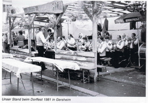 1980: Beim ersten Dorffest, das zwei Tage lang gefeiert wird, wirkt auch der Musikverein tatkräftig mit. Zusätzlich zu den musikalischen Darbietungen richten die Mitglieder auch einen Stand auf der „Lenn“ ein, um die zahlreichen Gäste zu bewirten. Bis zum letzten Dorffest 1999 ist der Musikverein fester Bestandteil dieses Festes.